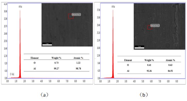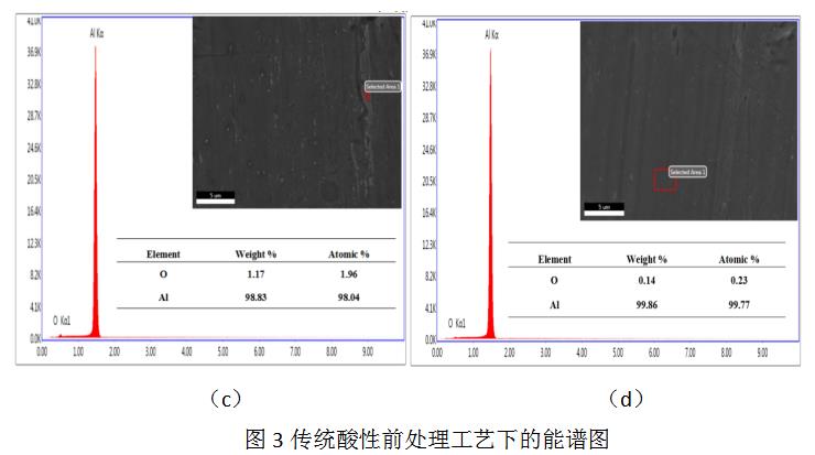 为验证其表面状态的变化,通过能谱对铝合金表面元素进行测试,图3(a)为铝合金未处理基体面扫能谱图,可以看到基体表面主要由铝元素和氧元素组成,氧的质量百分比在0.73%左右。图(b)为酸性脱脂后铝合金表面面扫能谱图,可知脱脂后铝合金表面氧元素质量百分比下降至0.41%,说明酸性脱脂对铝氧化膜较优异的刻蚀能力。图(c)为酸性脱脂后铝合金表面白色点条状物的点扫能谱图,可以看出脱脂后铝合金表面出现的白色点条状物含有非常高的氧元素,质量占比达到了1.17%,这也正印证了脱脂后表面白色点条状物为铝的氧化膜这一想法。图(d)为无铬钝化后铝合金表面面扫能谱图,氧元素质量百分比为0.14%,可以看到铝合金表面氧元素含量在此过程中还有消耗,并且在能谱中并未发现组成钝化膜的其他元素,可能是钝化膜中元素含量较低且并未达到仪器检测精度。