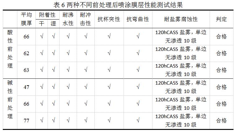 两组平行试样经两种不同前处理后喷涂膜层性能测试结果如表6、7所示,实验结果表明经新型碱性前处理工艺后的喷涂试样无论是在膜层附着性还是在耐蚀性上都达到了非常高的性能水平,完全符合生产要求及性能检测标准,基本不逊色于经传统酸性前处理生产出的粉末喷涂料。